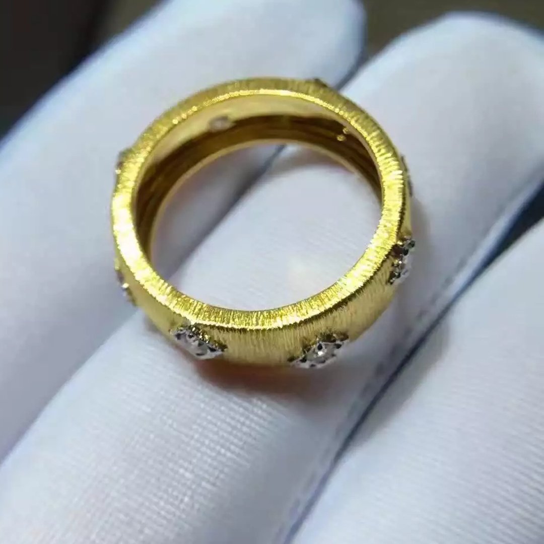 The ‘rigato’ effect, obtained by handmade engraving, reaches its peak of virtuosity in the Macri Collection. The surface is wavy and embellished with brilliant-cut diamonds set in tiny star-shaped rosettes. Small and shiny gold beads play with the opaque texture and the light of the diamonds.