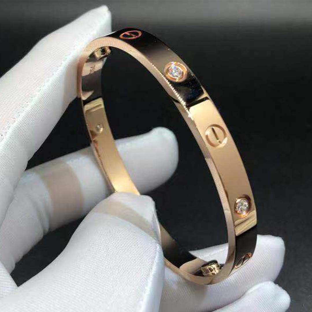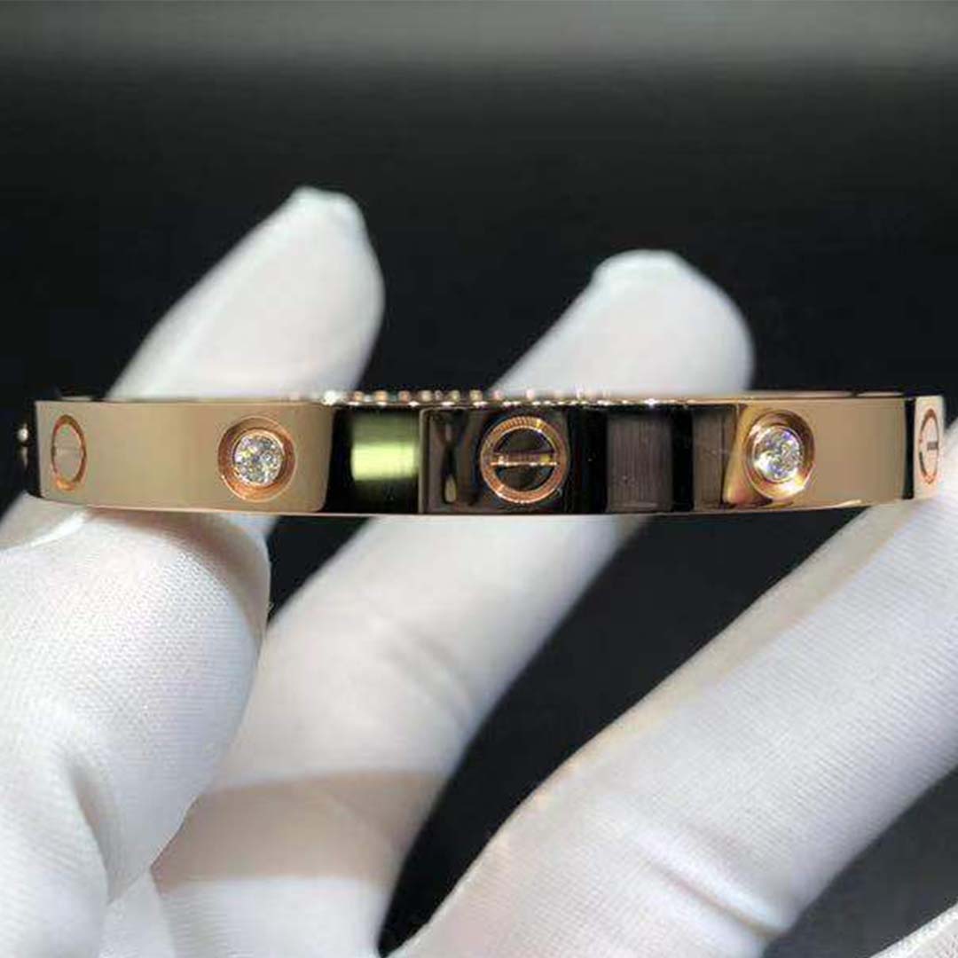 Part of Cartier’s classic LOVE collection, this stunning bangle is crafted of 18K pink gold with a four diamonds 0.42ct., and features the engraved Love symbol throughout. This Cartier Love bracelet has the new Cartier screw system that prevents the loss of the screws when removing it. This iconic bangle makes for the perfect accessory for any occasion, with the classic style of Cartier!