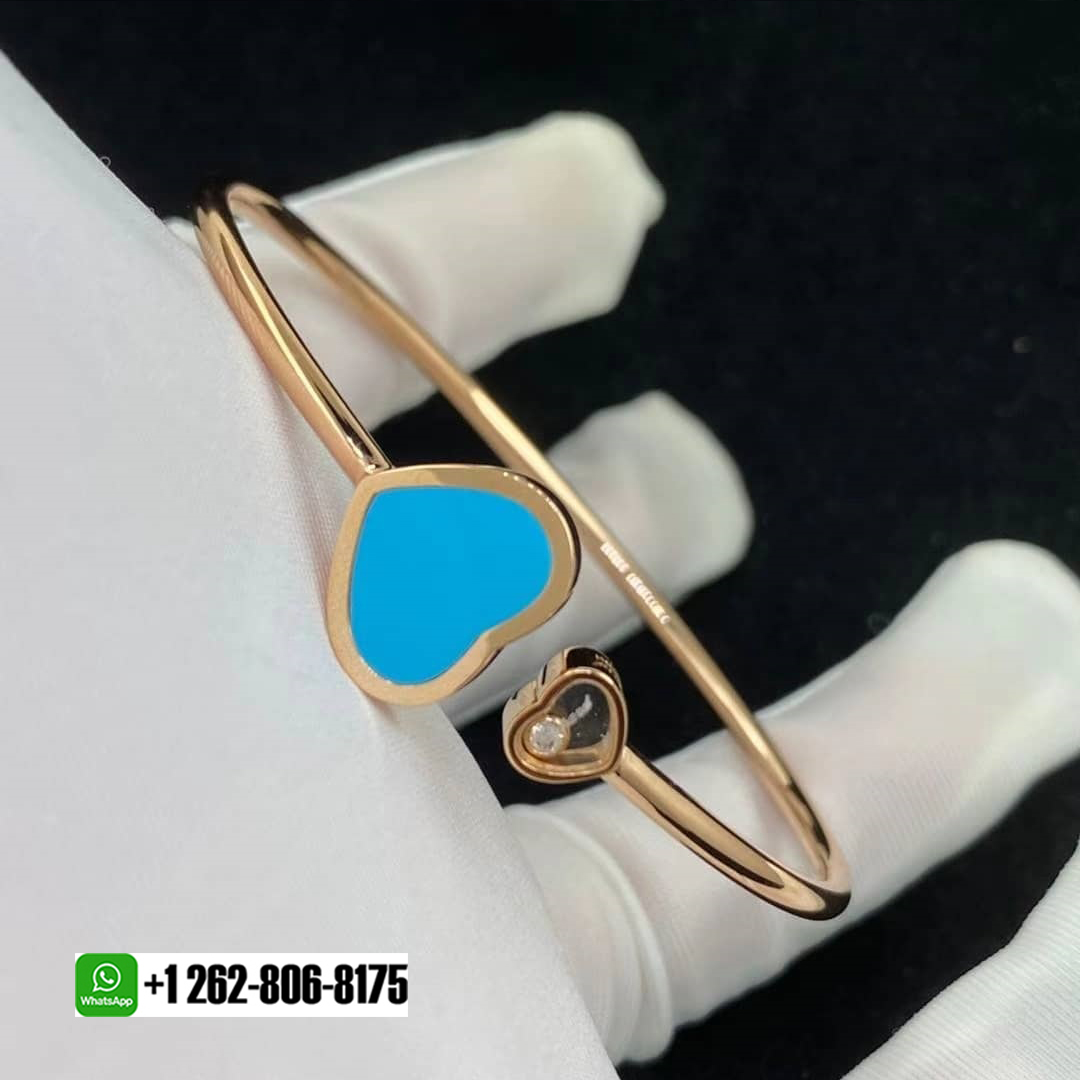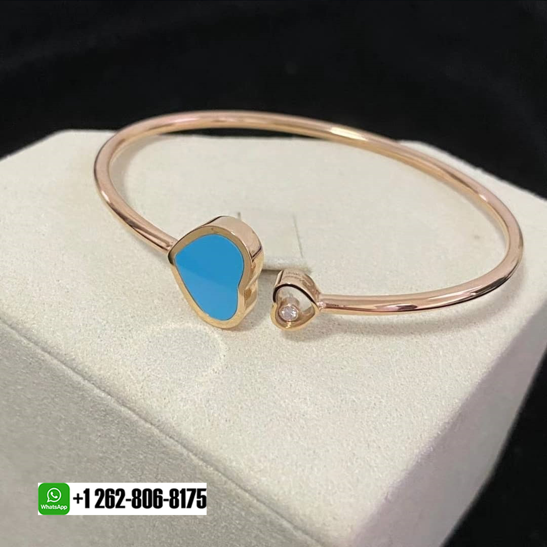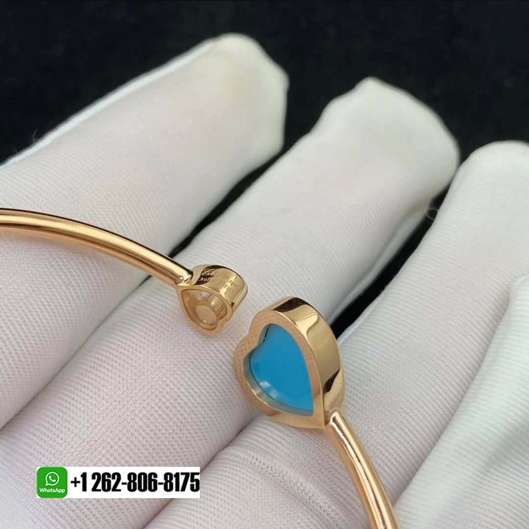 Chopard Happy Hearts 18k Rose Gold Turquoise Diamond Bangle Bracelet. The Happy Hearts line embraces the heart as a symbolic motif of the Happy Diamonds collection, interpreting it with playful creativity. This timeless bracelet in 18-carat rose gold shines with an elegant heart at either end: a large heart with rose stone and a small heart housing one of Chopard’s celebrated moving diamonds, in a sparkling celebration of love.