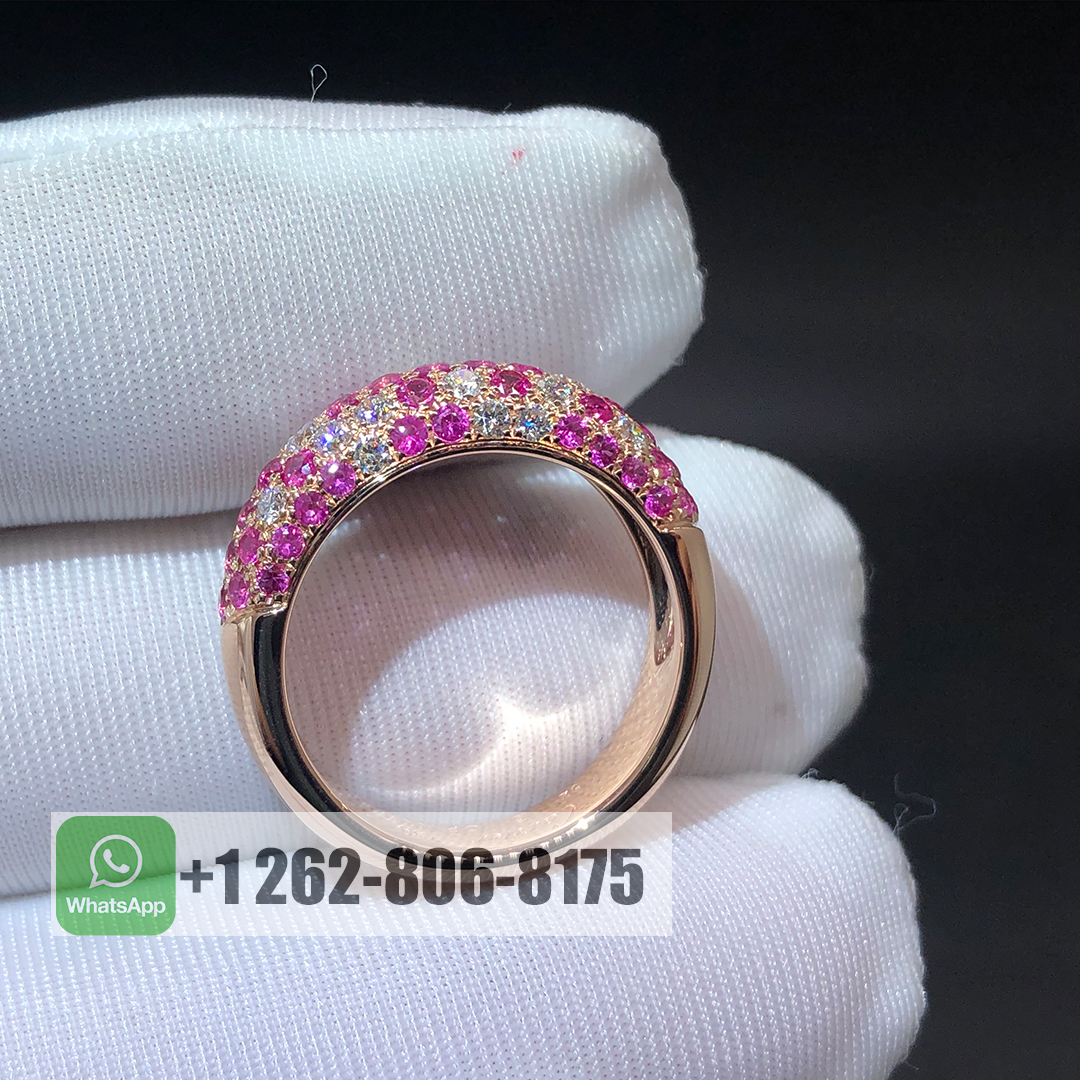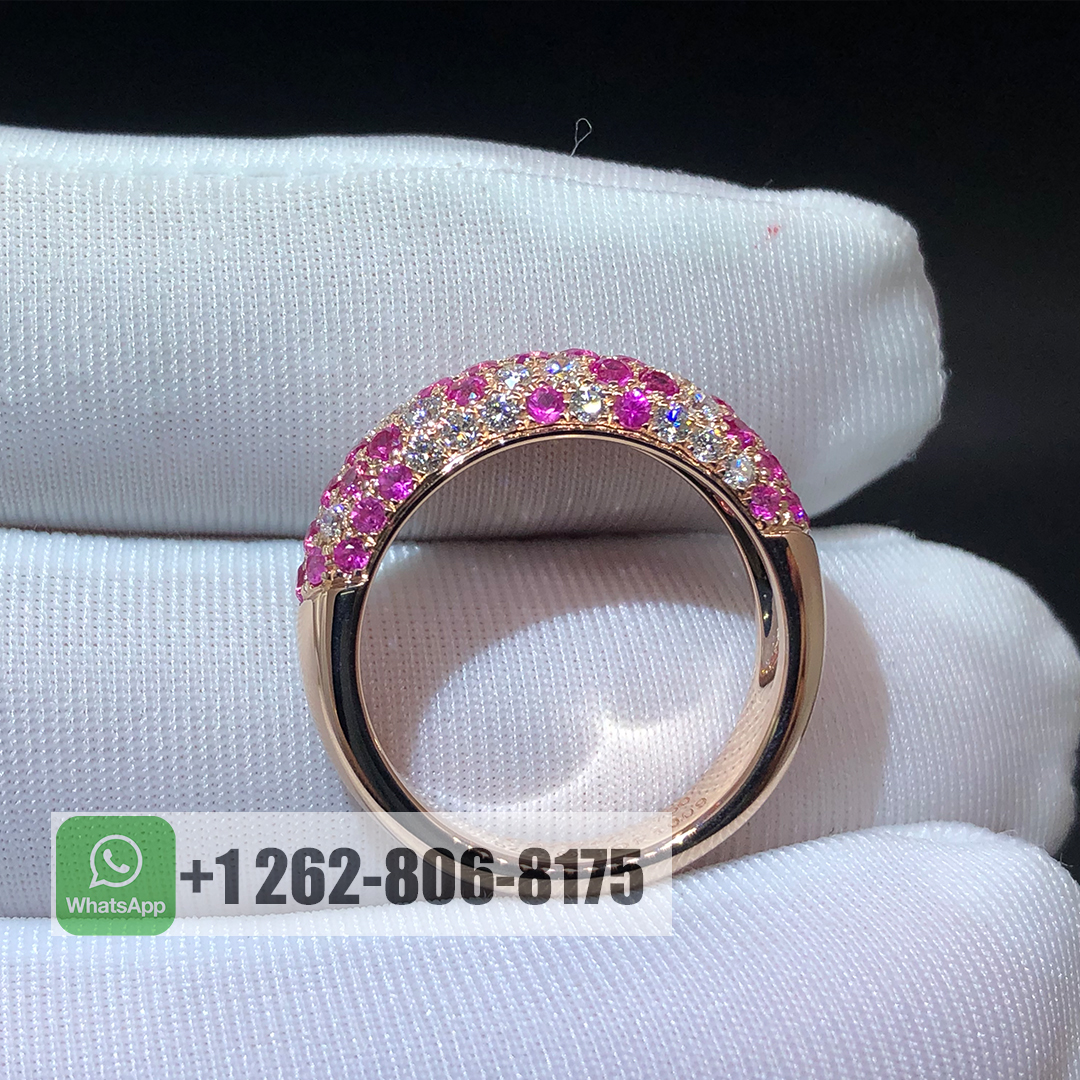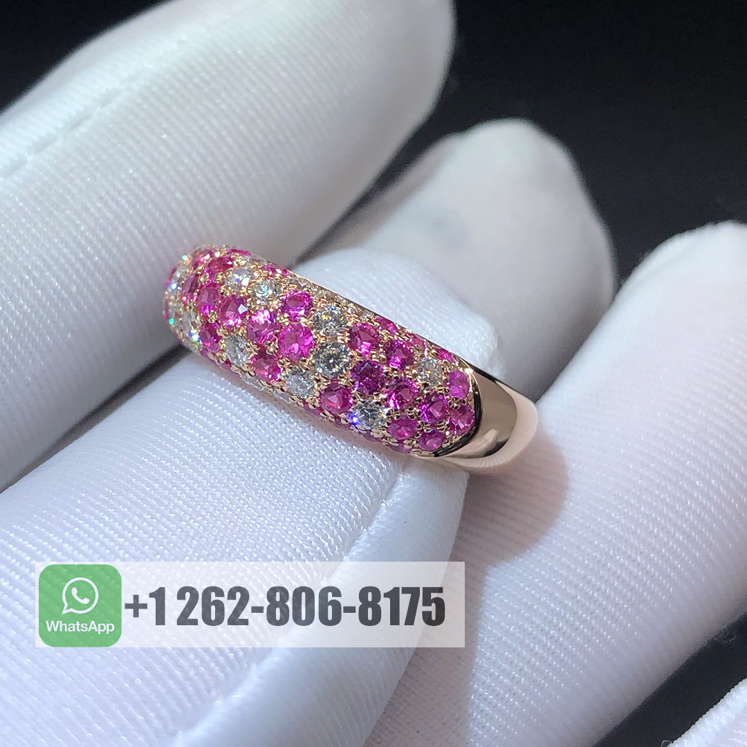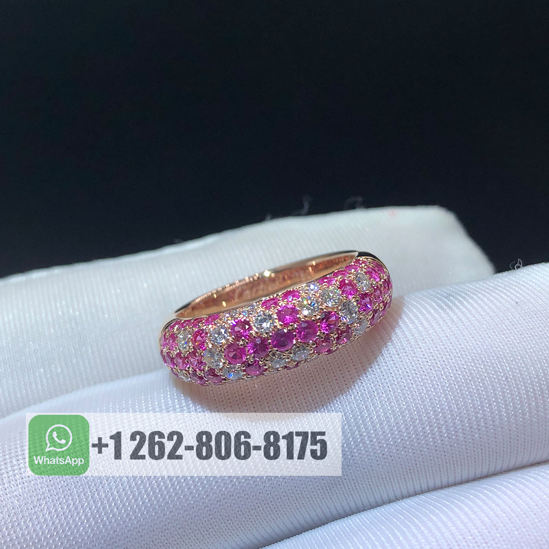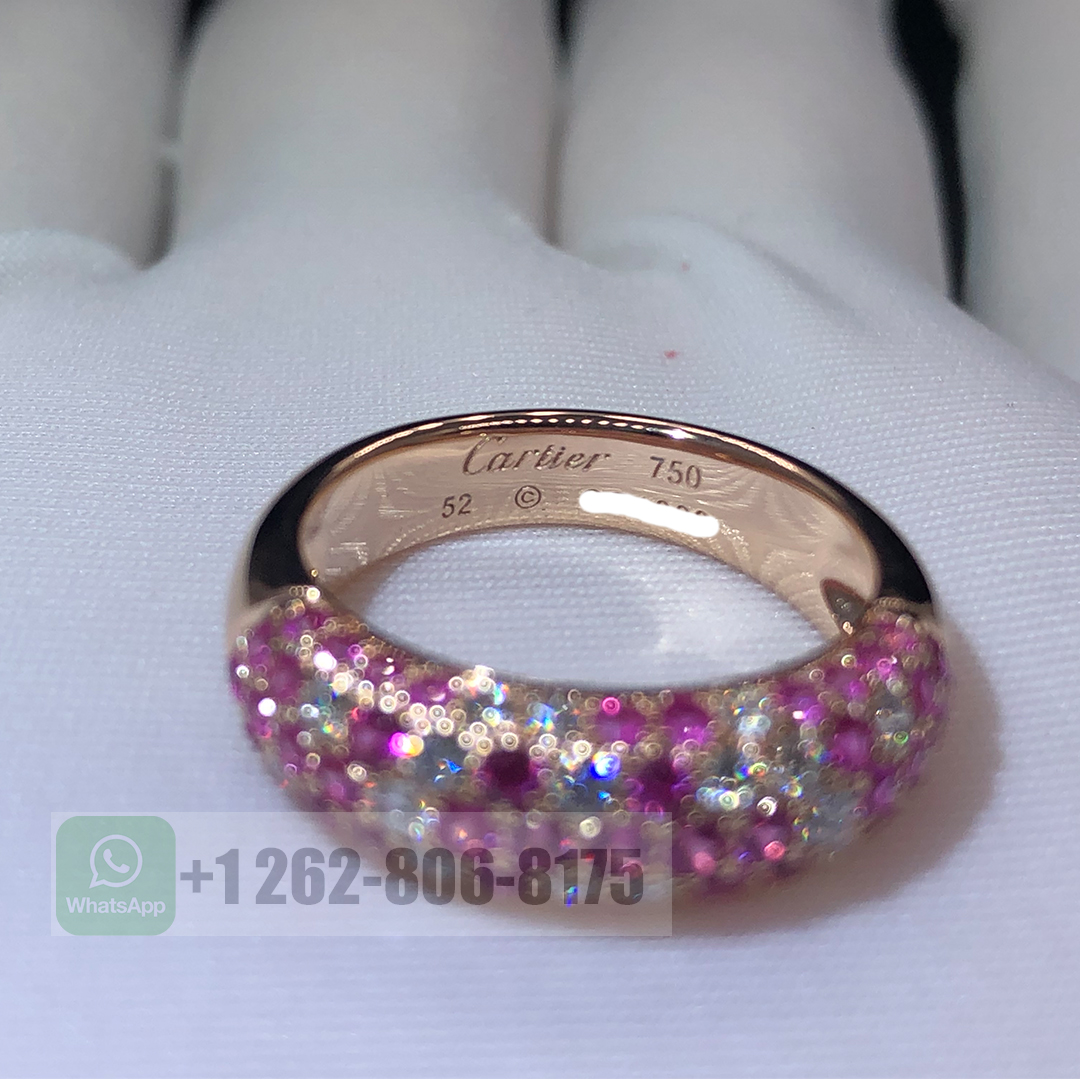 An 18k rose gold diamond and sapphire ring by Cartier from the Etincelle collection. The ring comprises of pave set pink sapphire and round brilliant cut diamonds alternating in formation half set across the band. The diamonds have an approximate weight of 0.36ct and the sapphires have an approximate weight of 0.72ct.