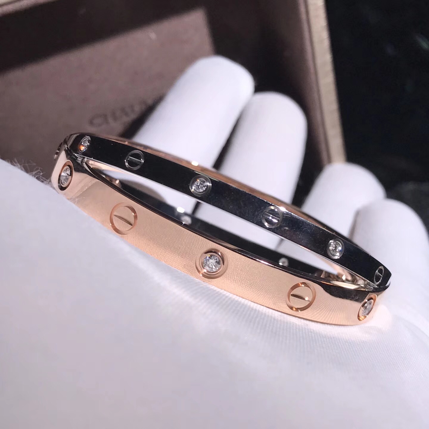 The 18k Rose Gold and White Gold with 12 Diamond Cartier Love Bracelet made of 18 karat pink and white gold set with 12 brilliant cut diamonds totaling approximately 0.78 total carat weight. Enjoy this stunning bracelet from the iconic style of Cartier!