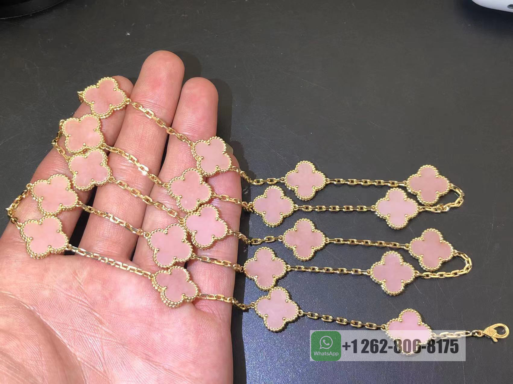 • Custom VCA Vintage Alhambra 18K Yellow Gold Pink Opal 20 Motifs Long Necklace