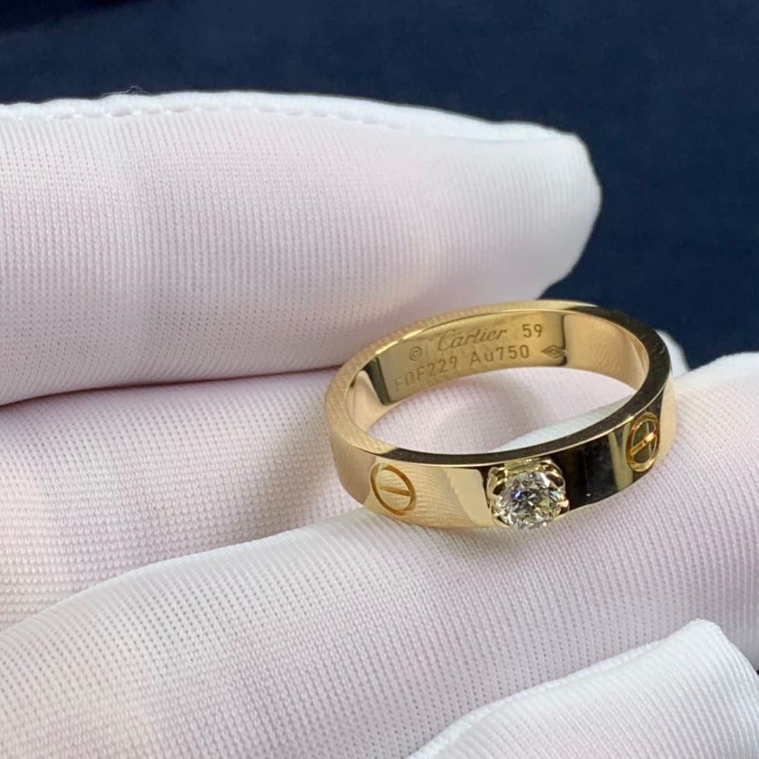 Love Solitaire, 18K yellow gold, set with a brilliant-cut diamond available from 0.23 to 1.15 carats. Width: 3.65 mm for metric sizes 42 to 56 and 4 mm for metric sizes starting from 57. Thickness: 1.4 mm.