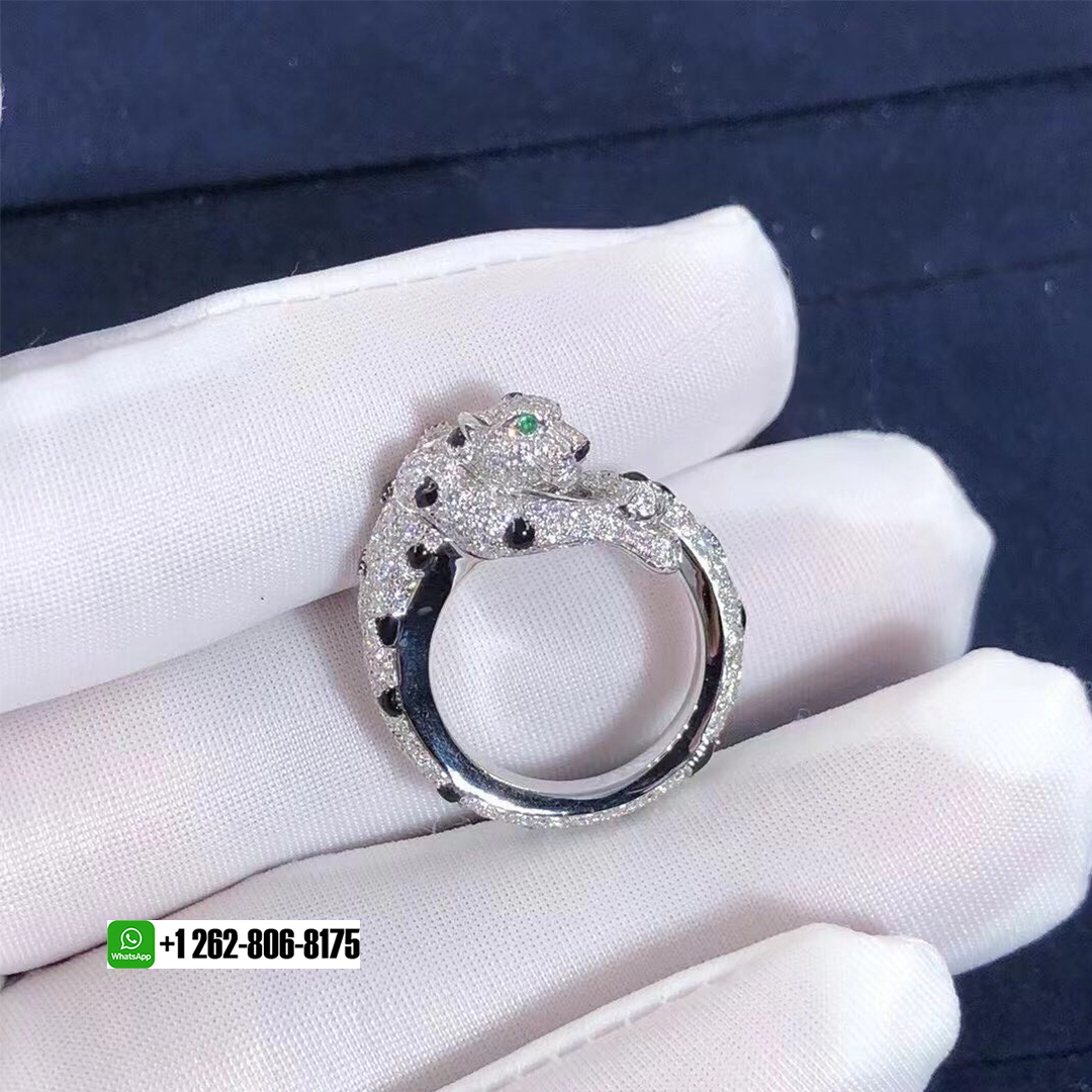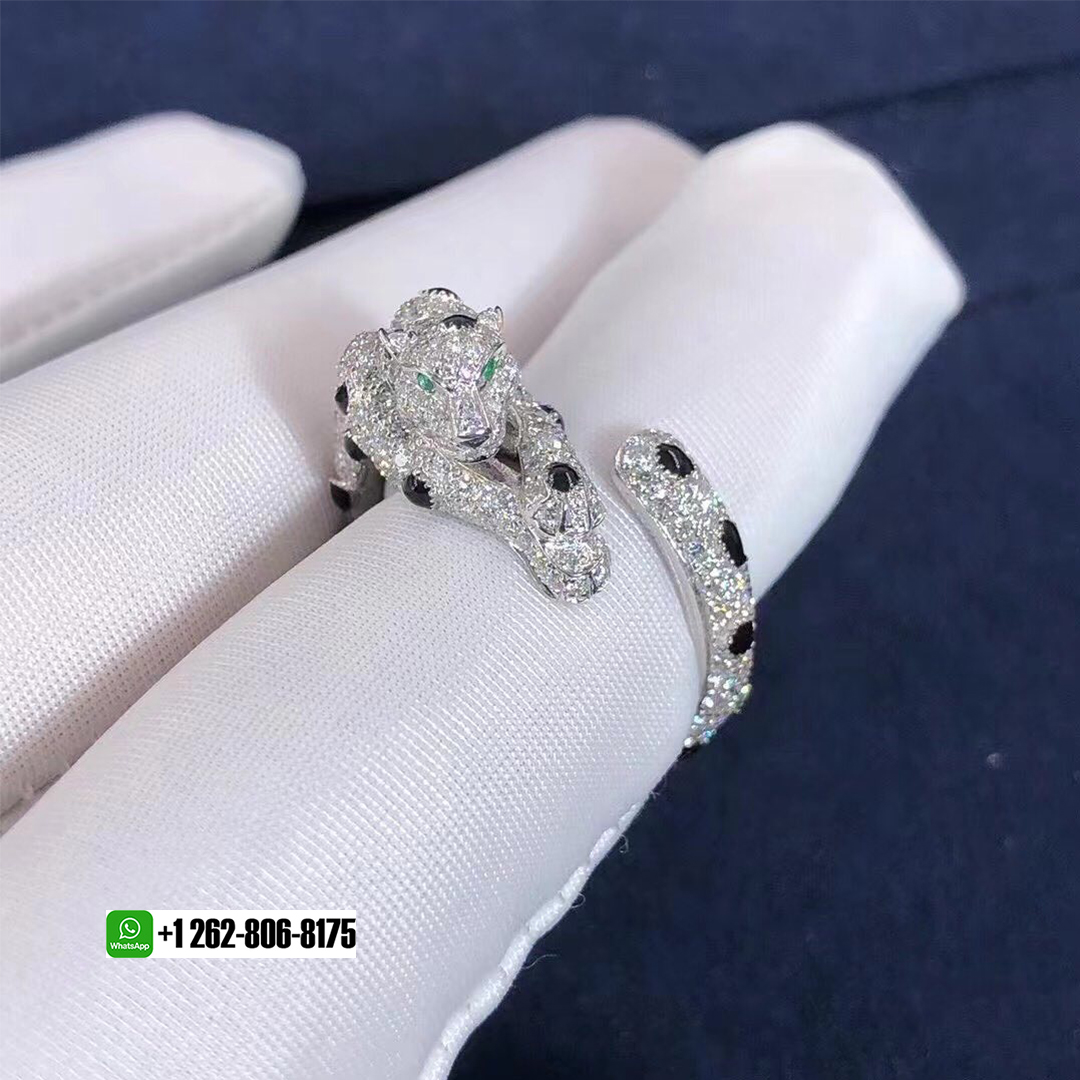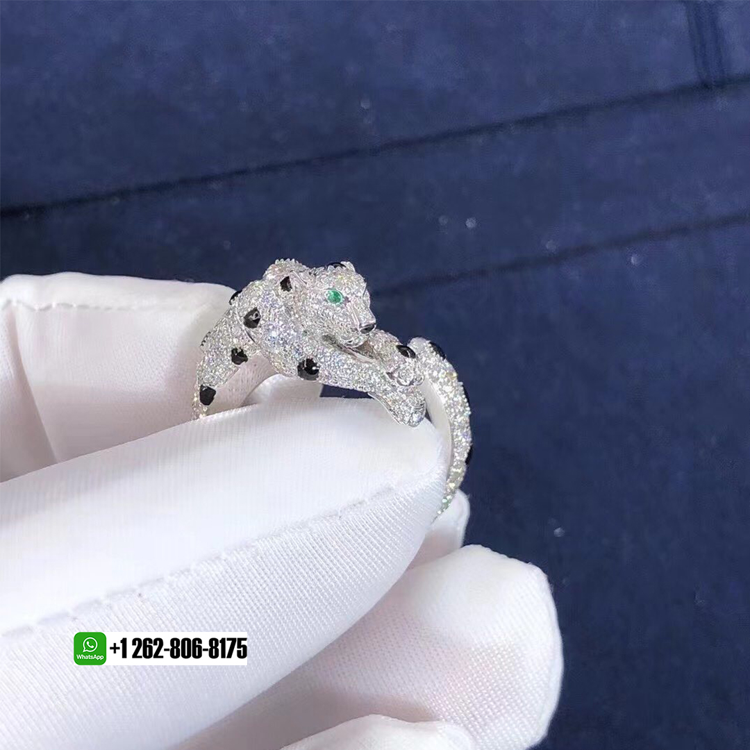 Panthère de Cartier ring, 18K white gold, onyx, set with 2 emeralds and 264 brilliant-cut diamonds totaling 1.66 carat.