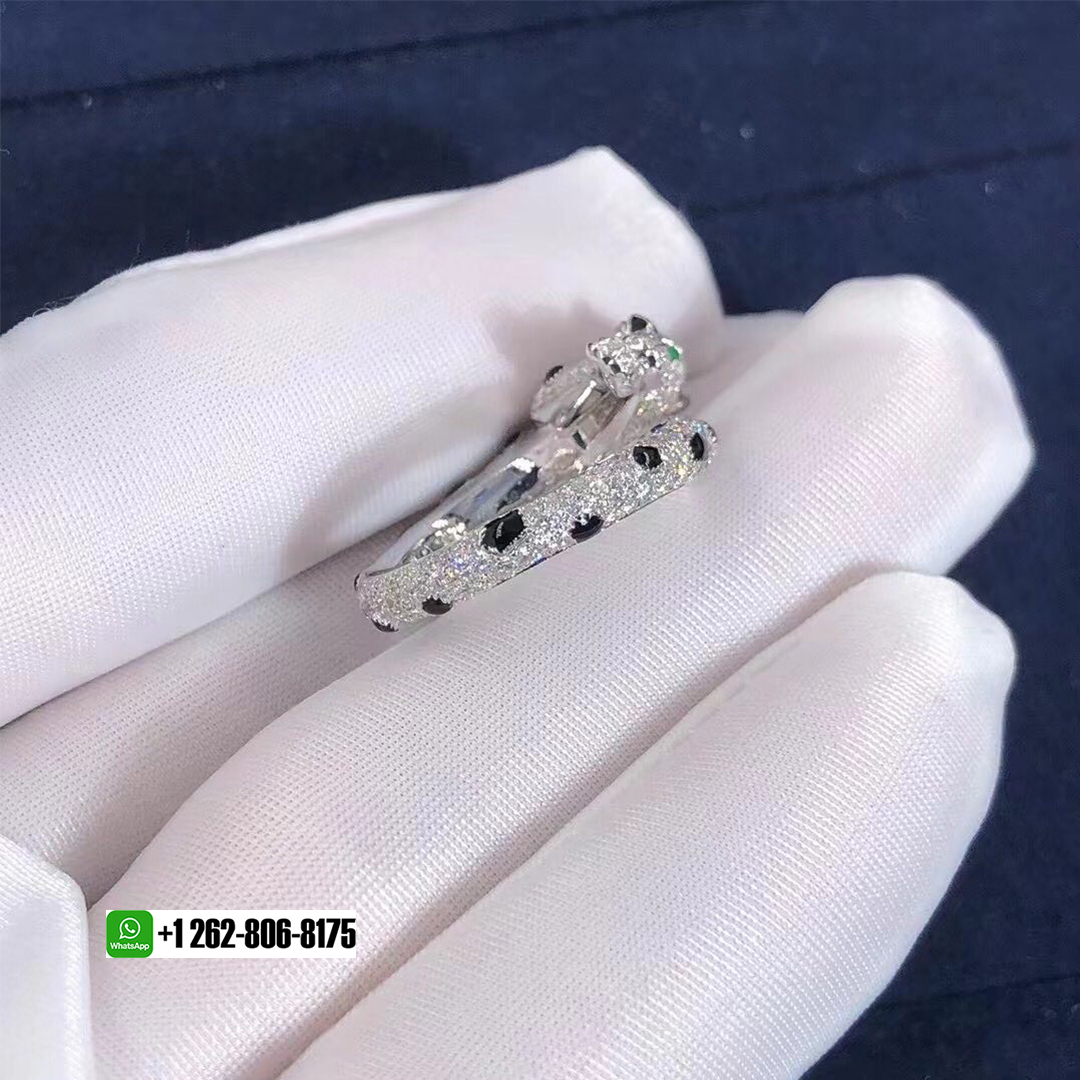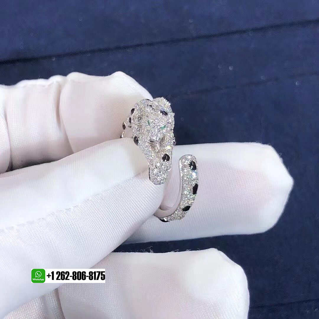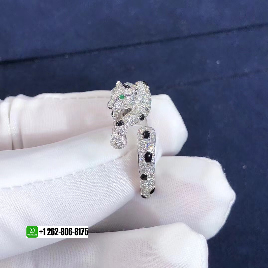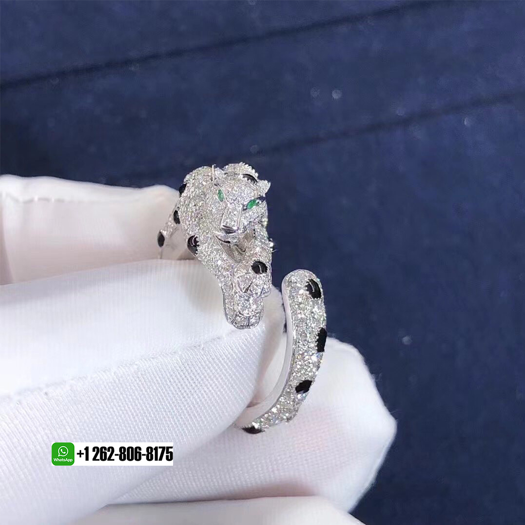 Panthère de Cartier ring, 18K white gold, onyx, set with 2 emeralds and 264 brilliant-cut diamonds totaling 1.66 carat.