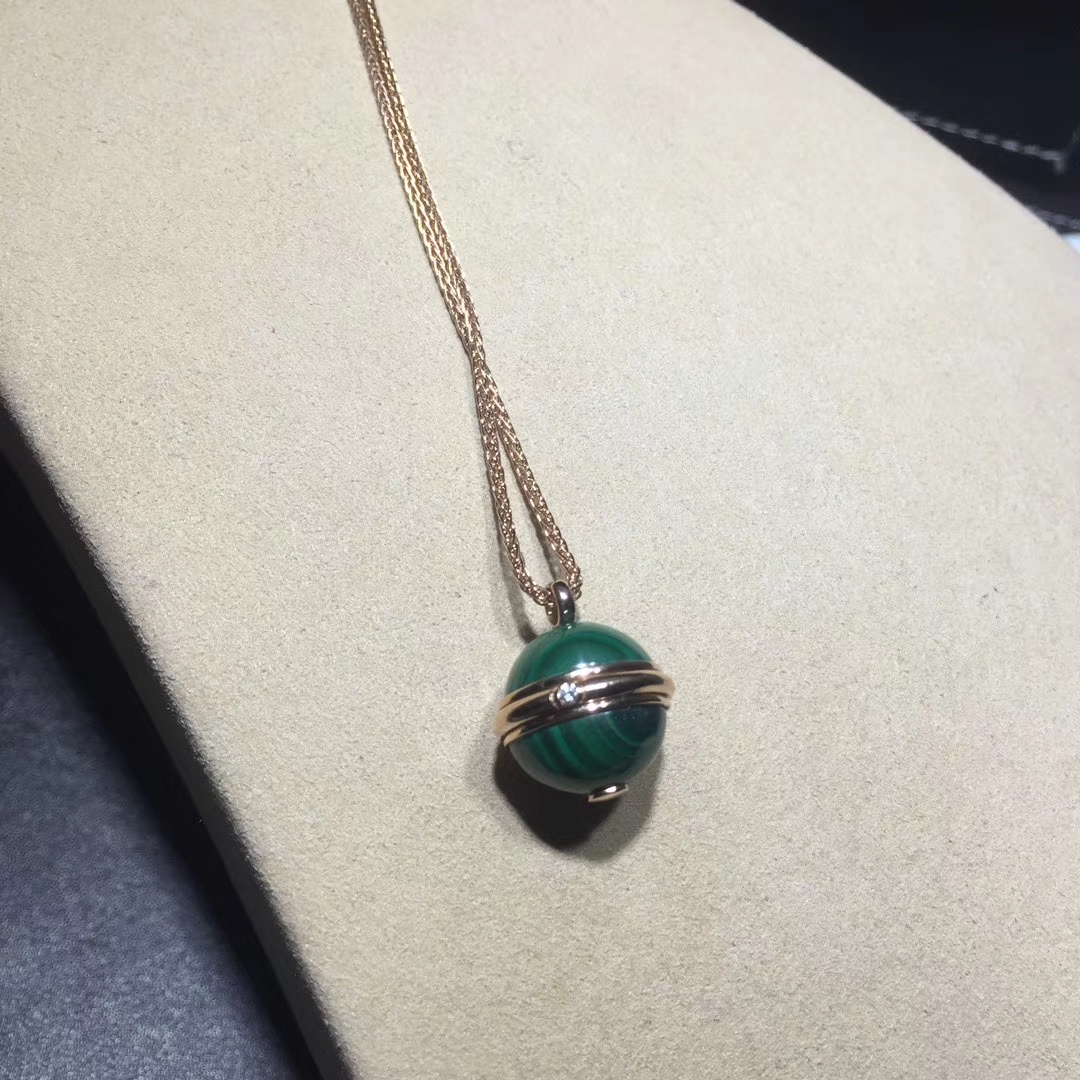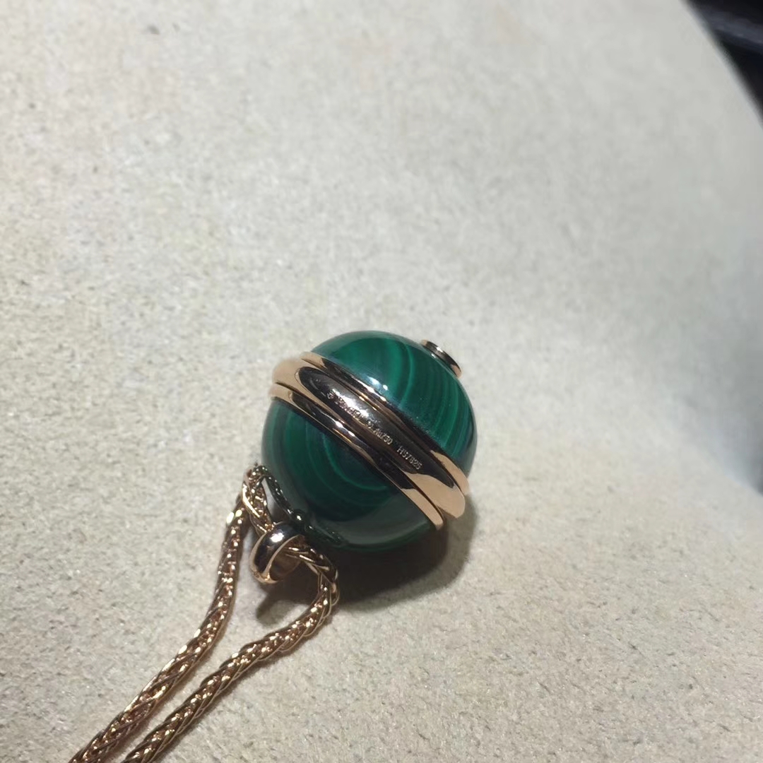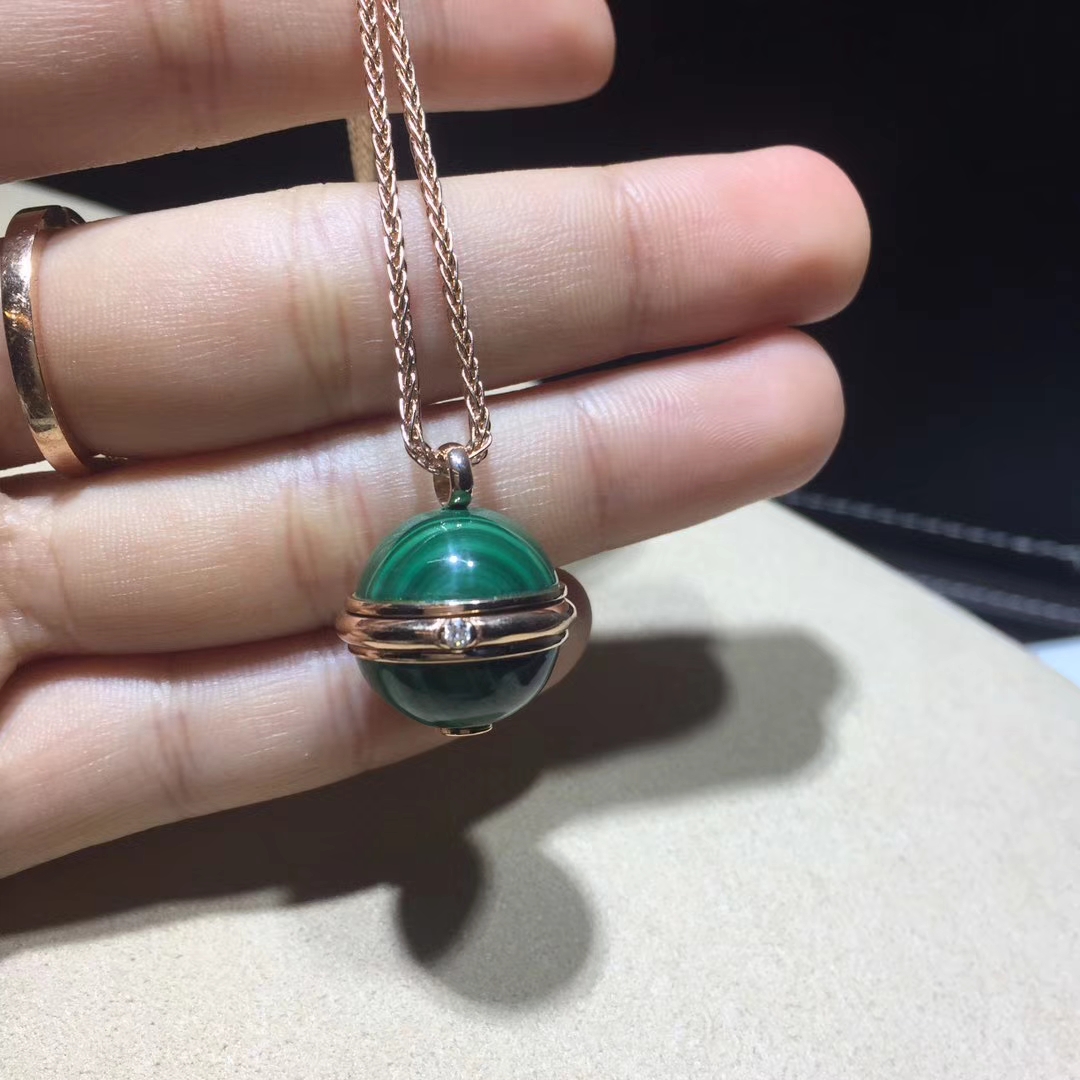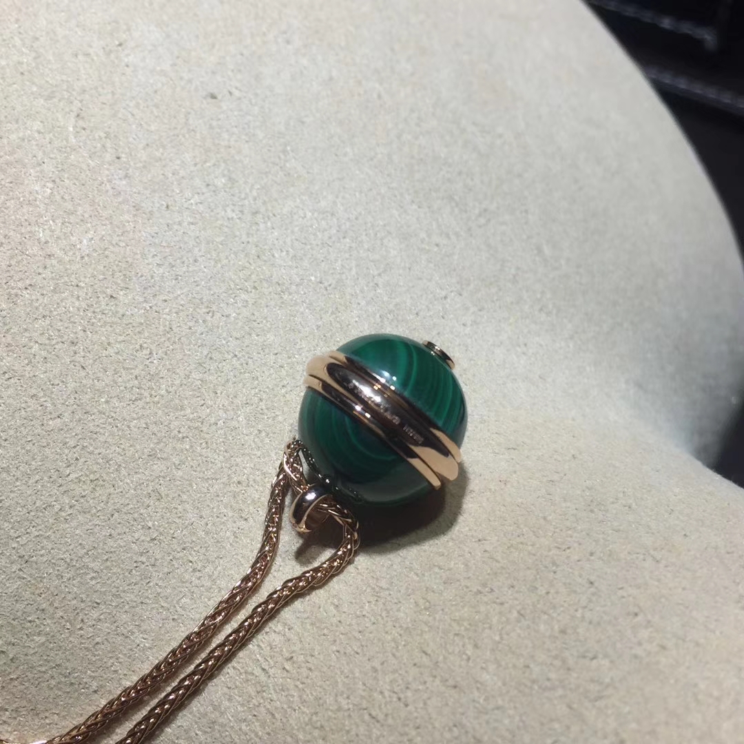Rose gold long necklace with a green malachite pendant adorned with the turning Possession ring. A Piaget signature jewelry creation surrenders to the beauty of color with the arrival of ornamental stones. Vibrant and captivating, the colorful stones express the many facets of a Possession woman’s personality. Wrapped around two bright green malachite cabochons, the Piaget Possession ring becomes an elegant rose gold pendant. Set with a single brilliant diamond, the precious turning ring is an irresistible invitation to experience an evocative jewelry ritual. One simple and unforgettable gesture. With the turn of the gold ring around her malachite pendant, the independent woman sets her world in motion with new experiences, new emotions and moments of pure joy.
