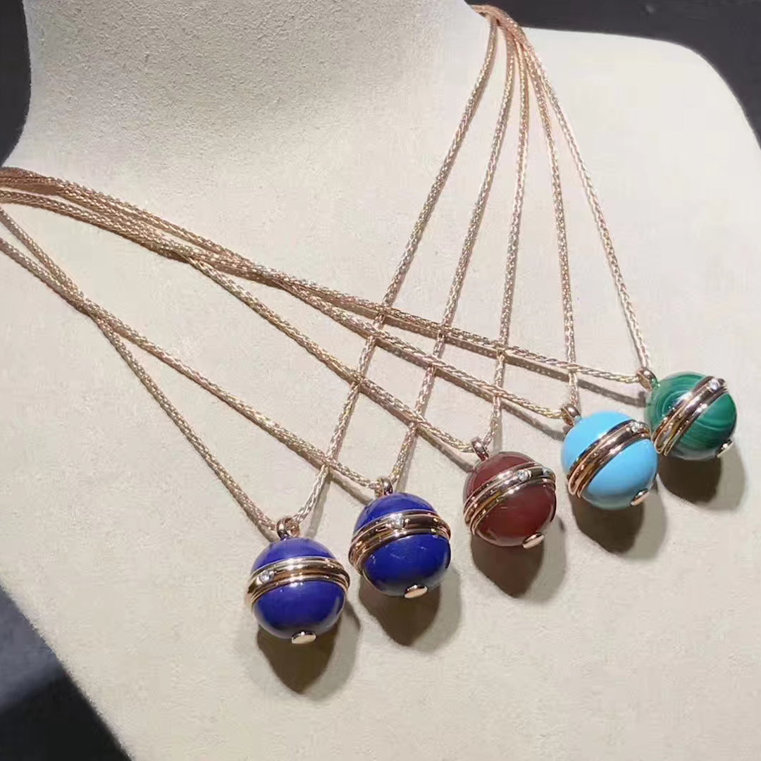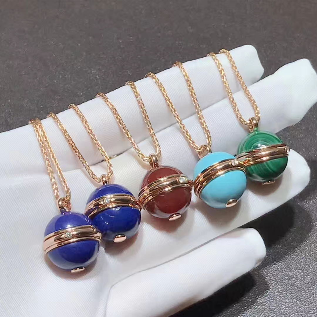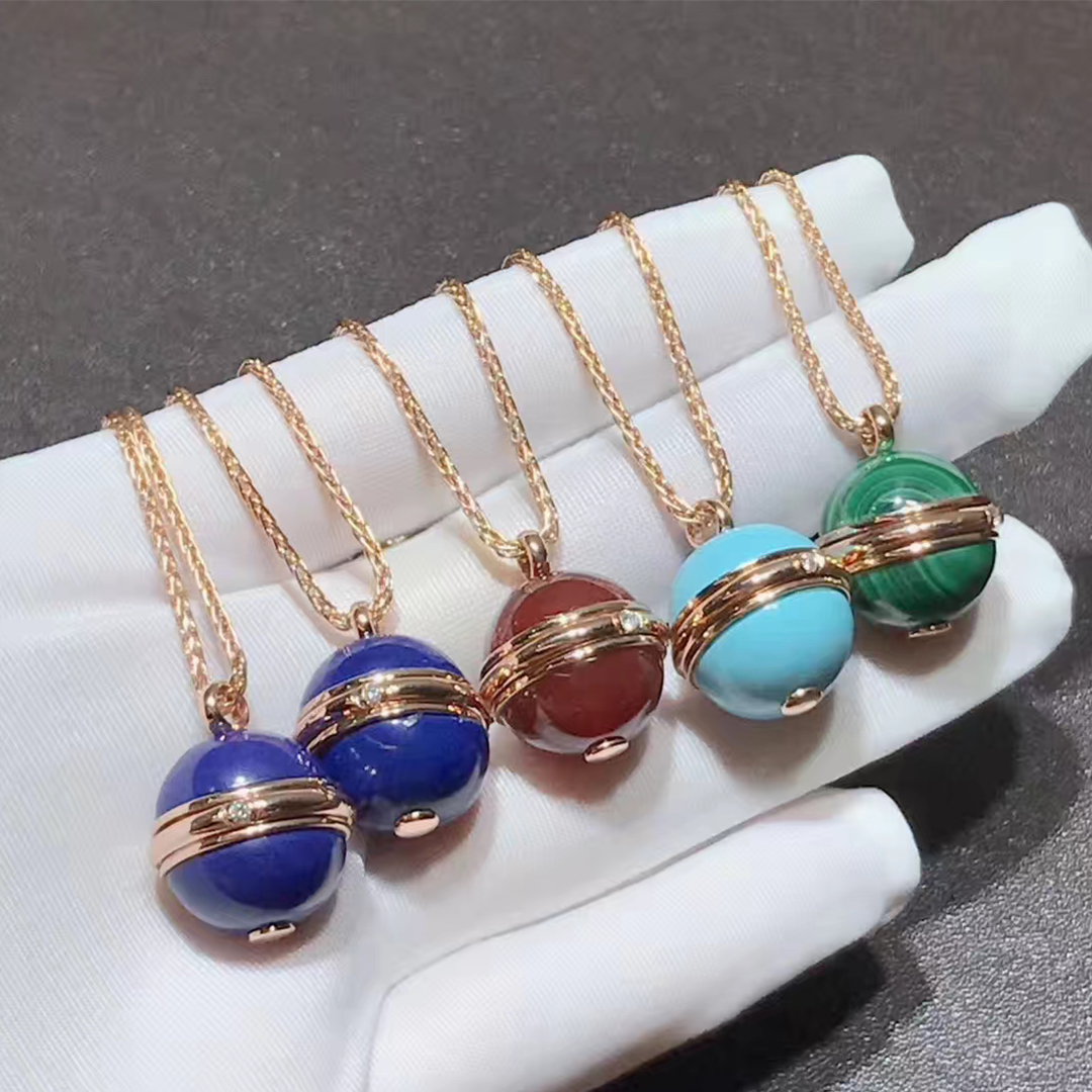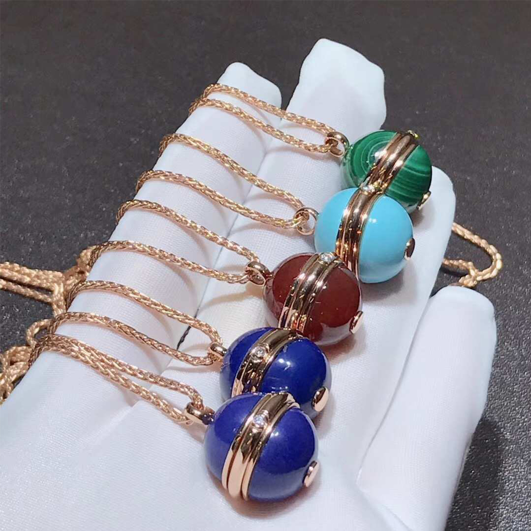 Rose gold long necklace with a green malachite pendant adorned with the turning Possession ring. A Piaget signature jewelry creation surrenders to the beauty of color with the arrival of ornamental stones. Vibrant and captivating, the colorful stones express the many facets of a Possession woman’s personality. Wrapped around two bright green malachite cabochons, the Piaget Possession ring becomes an elegant rose gold pendant. Set with a single brilliant diamond, the precious turning ring is an irresistible invitation to experience an evocative jewelry ritual. One simple and unforgettable gesture. With the turn of the gold ring around her malachite pendant, the independent woman sets her world in motion with new experiences, new emotions and moments of pure joy.