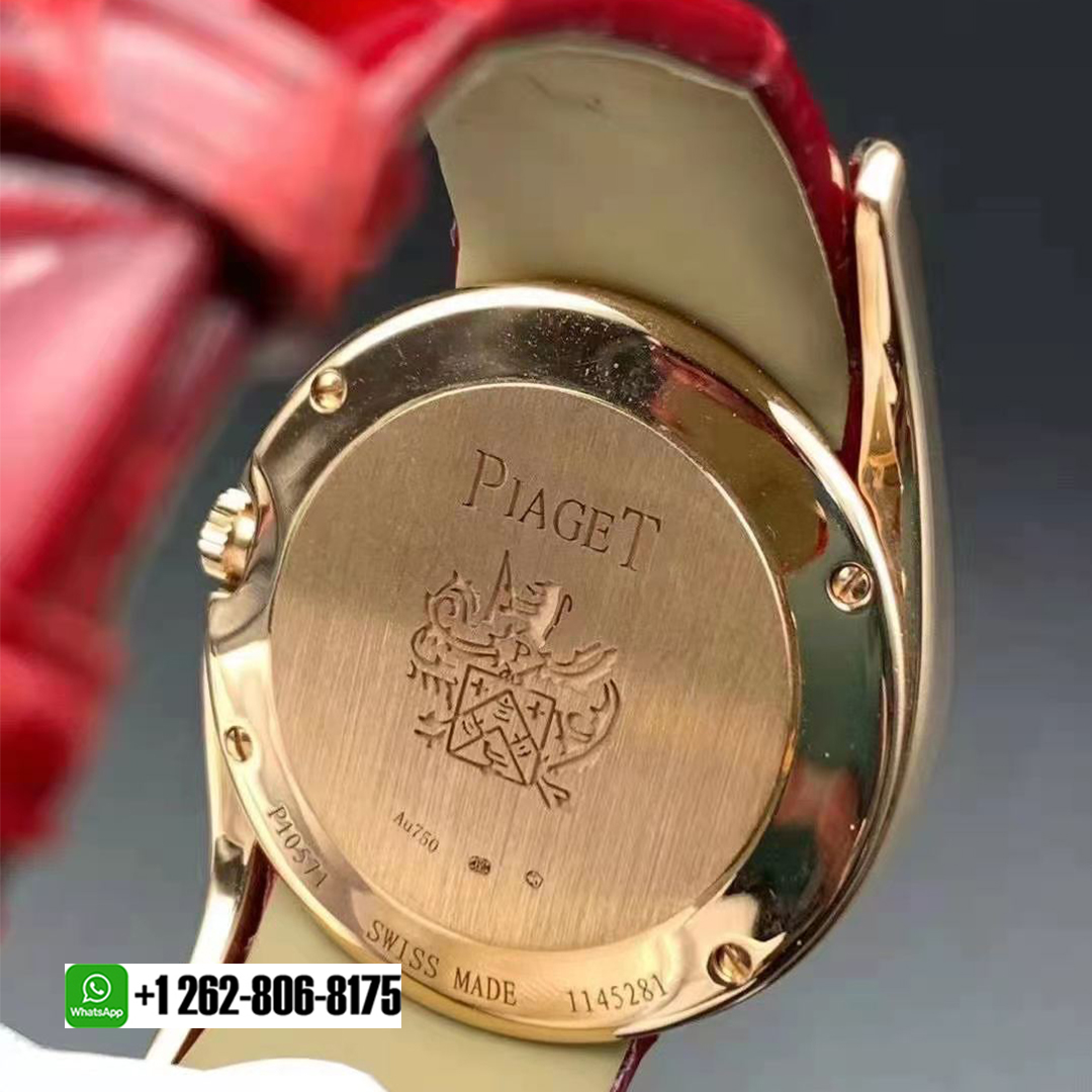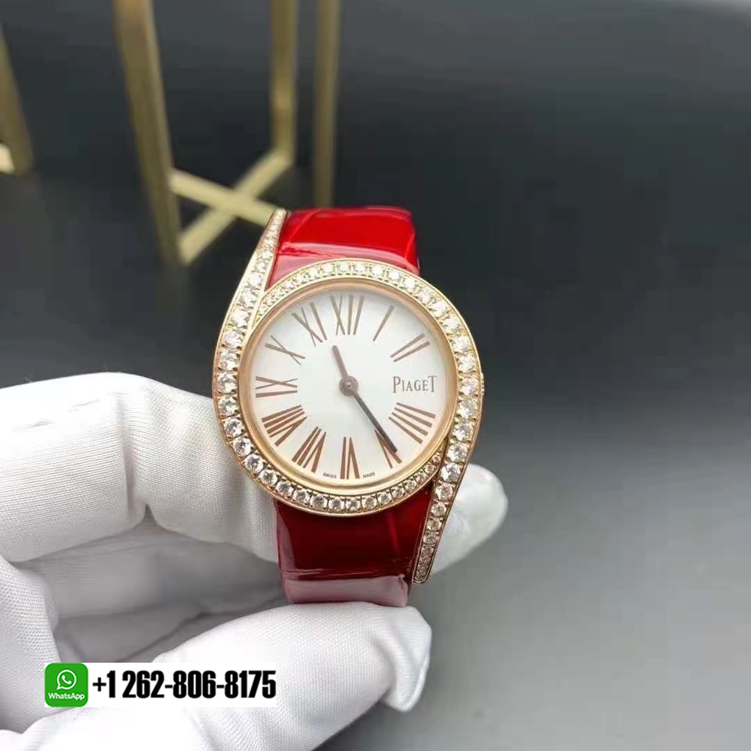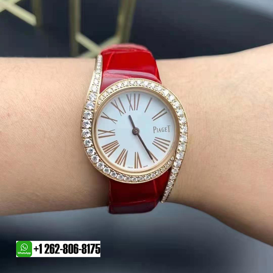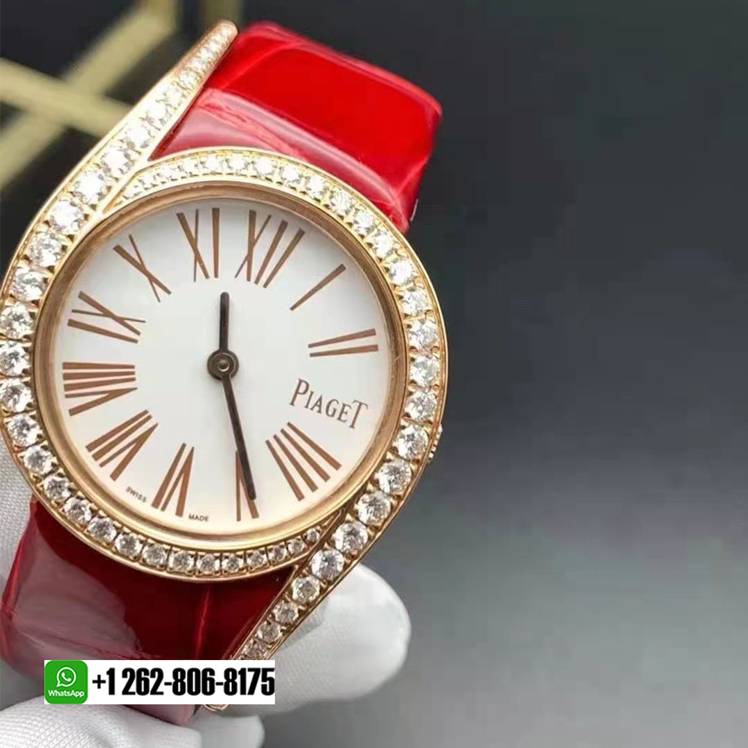 Women’s watch in rose gold and diamonds. Red carnelian alligator-skin strap. Radiant, vibrant and seductive: these are three adjectives that perfectly capture the spirit of this new luxury watch created by Piaget. It takes the linearity out of time, placing it instead on a curve of pure femininity. Its round 32 mm rose gold case is enhanced by two elegant elongated lugs. The voluptuousness of its curves is highlighted on the bezel by a graduated row of round diamonds. The purity of its silver-colored dial has a very contemporary classicism, with its Roman numerals in powdered rose gold that strike a common chord with the red carnelian alligator-skin strap closed by a gem-set gold pin buckle.