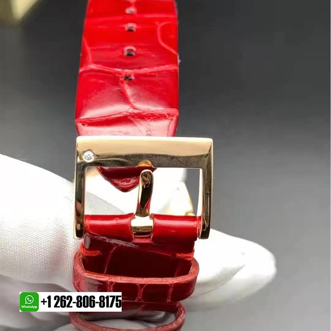 Piaget’s elegant ‘Limelight Gala’ watch is as attention-stealing as the name suggests. 18kt rose gold case with a red crocodile leather strap. Fixed rose gold bezel set with diamonds. Silver dial with rose gold hands and Roman numeral hour markers. Piaget logo at the 3 o’clock position.
