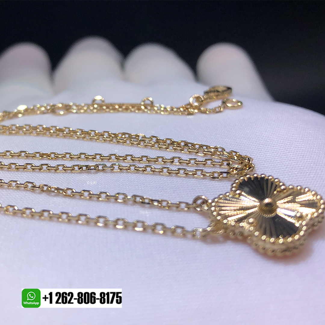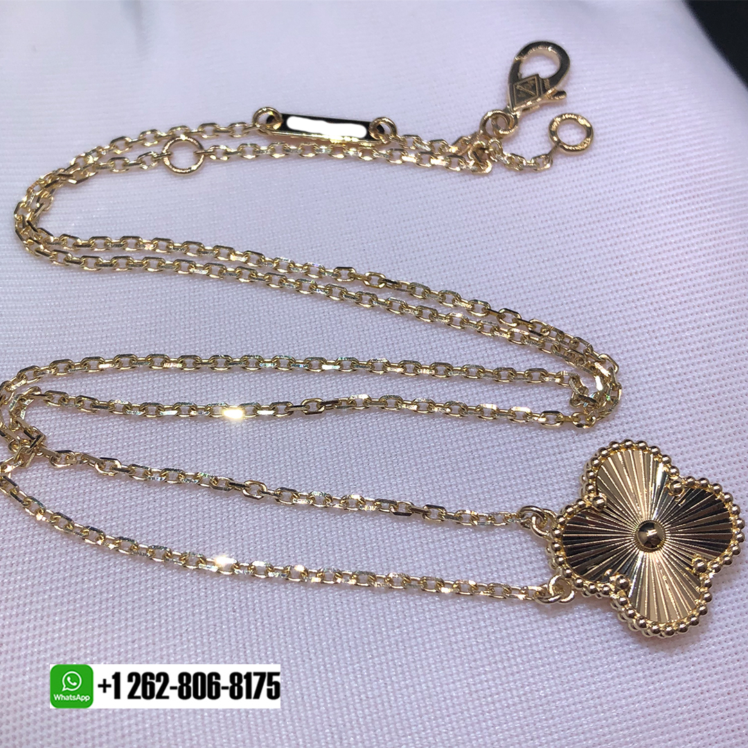 This bold yet elegant pendant is finely crafted of 18 karat yellow gold with 1 clover motif with a Guilloché texture. This is an exquisite pendant necklace for the classical elegance only from Van Cleef & Arpels!