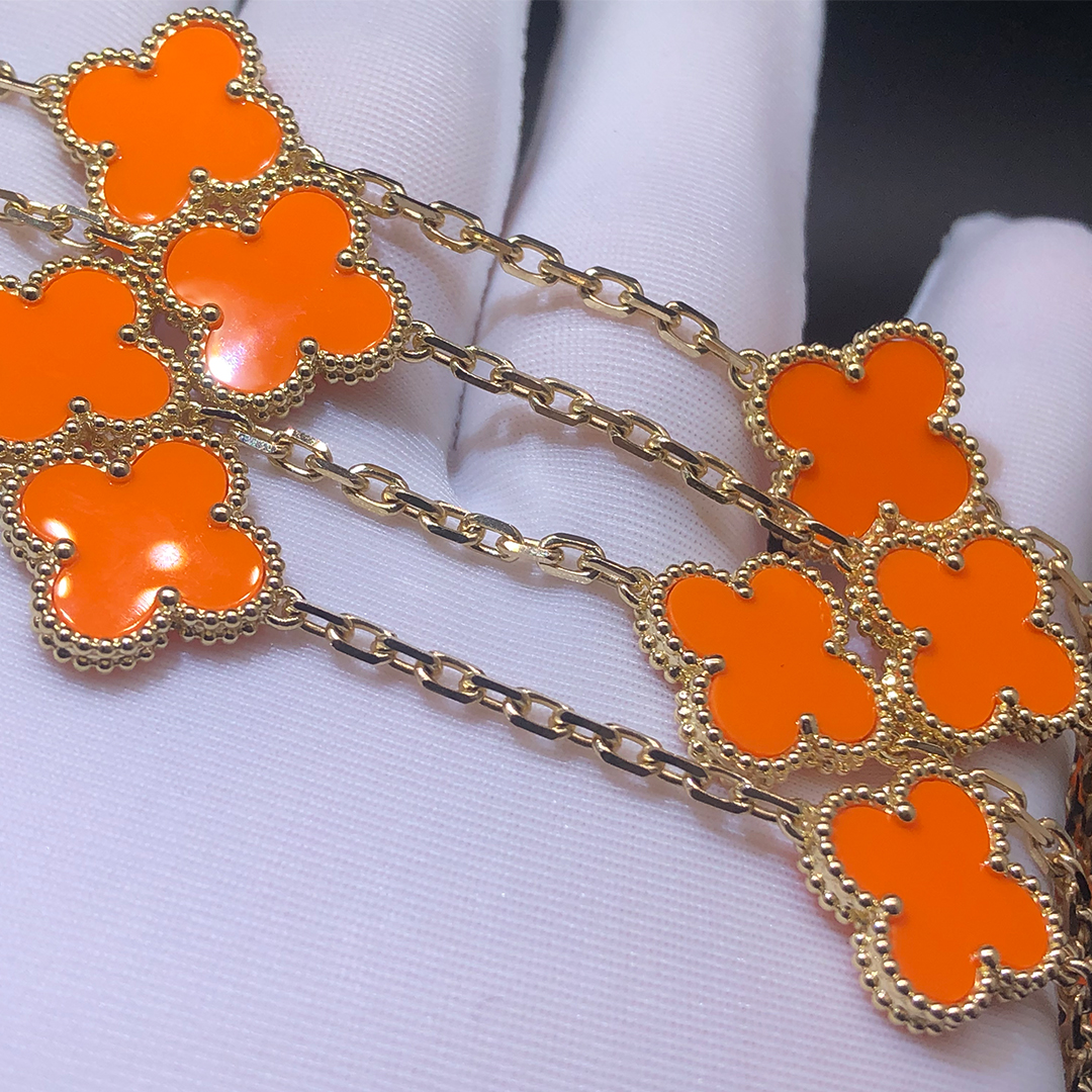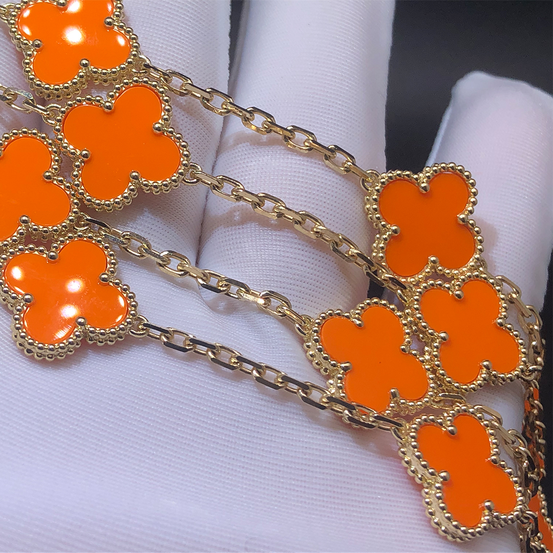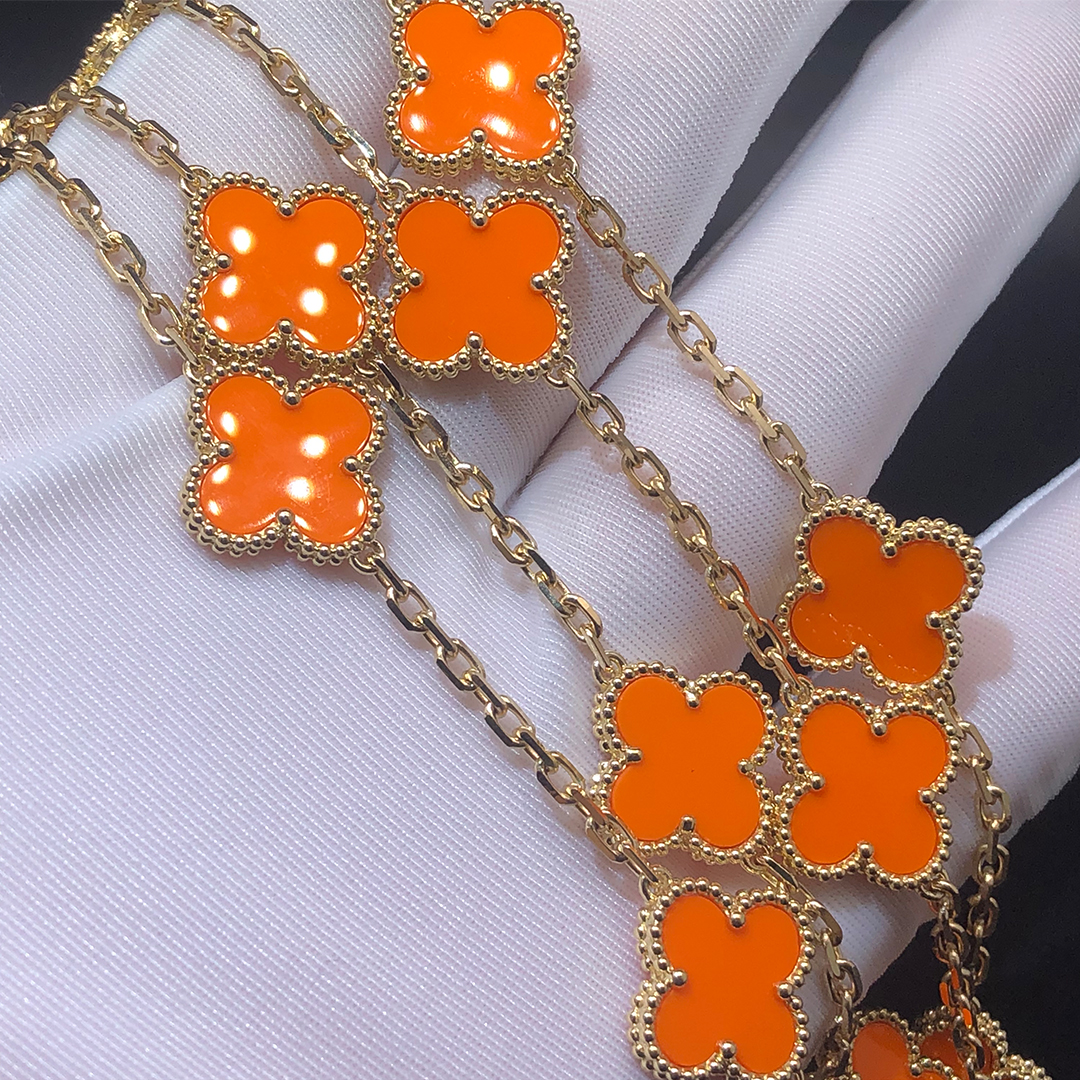 If you are interested in this Van Cleef & Arpels 18K Yellow Gold 20 Motifs Orange Coral Vintage Alhambra Necklace, Please contact us via the contact form via whatsapp +1 262 806 8175 or email [email protected].
