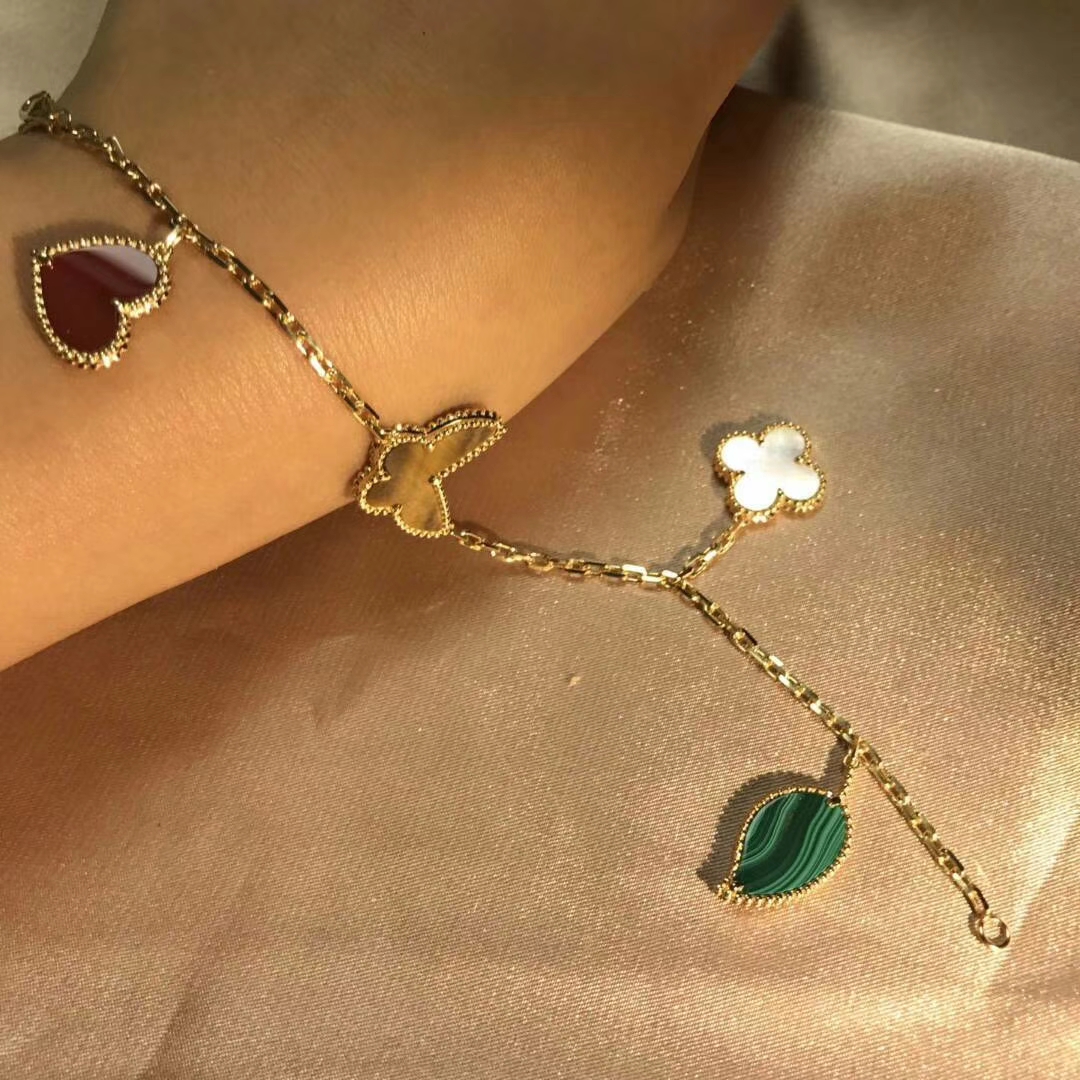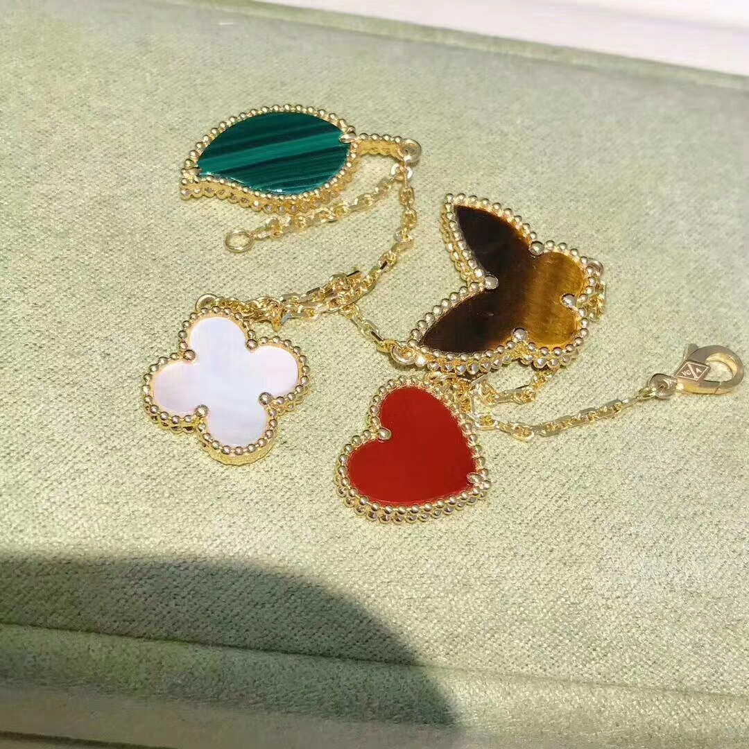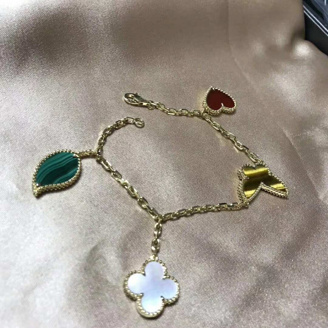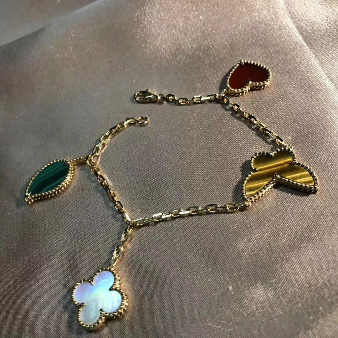 Lucky Alhambra bracelet, 4 motifs, 18K yellow gold, carnelian, tiger’s eye, white and gray mother-of-pearl, malachite.