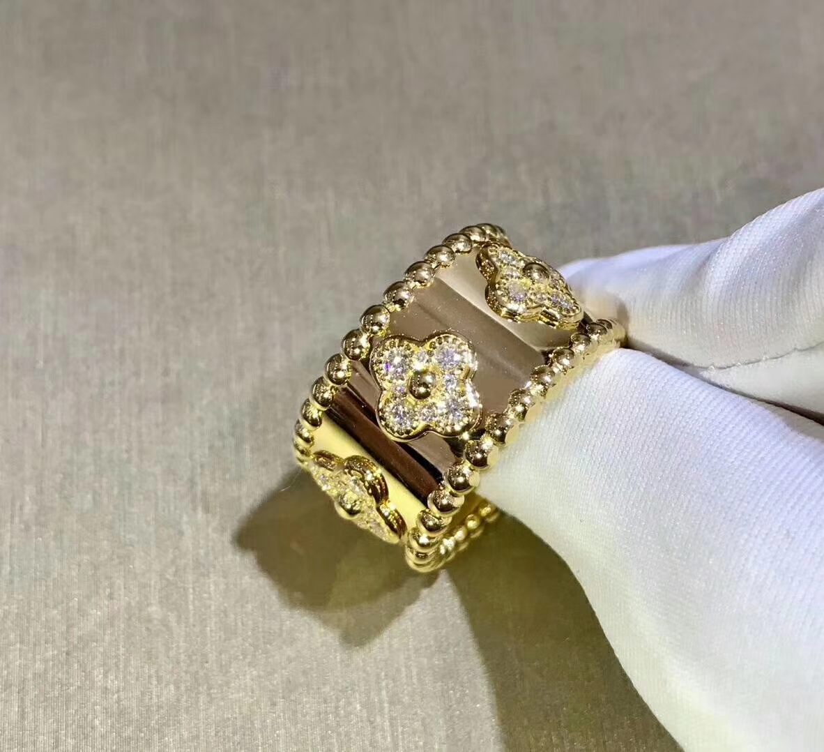 Perlée clovers ring, yellow gold, round diamonds, medium model; diamond quality DEF, IF to VVS.