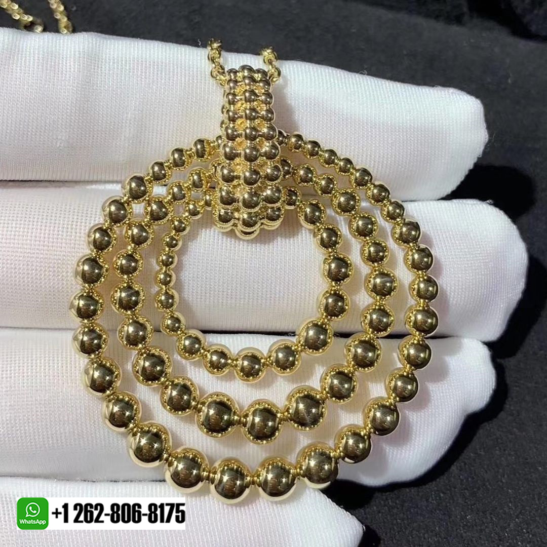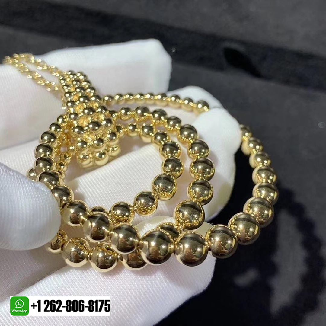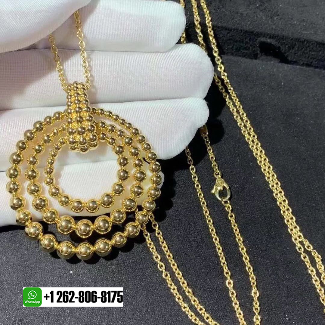 On a long chain in yellow gold, a pendant made up of three different-sized rings showcases the golden beads, motif which inspired the Maison’s creations for decades.