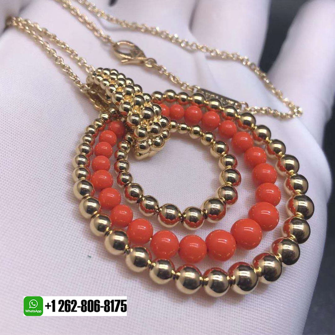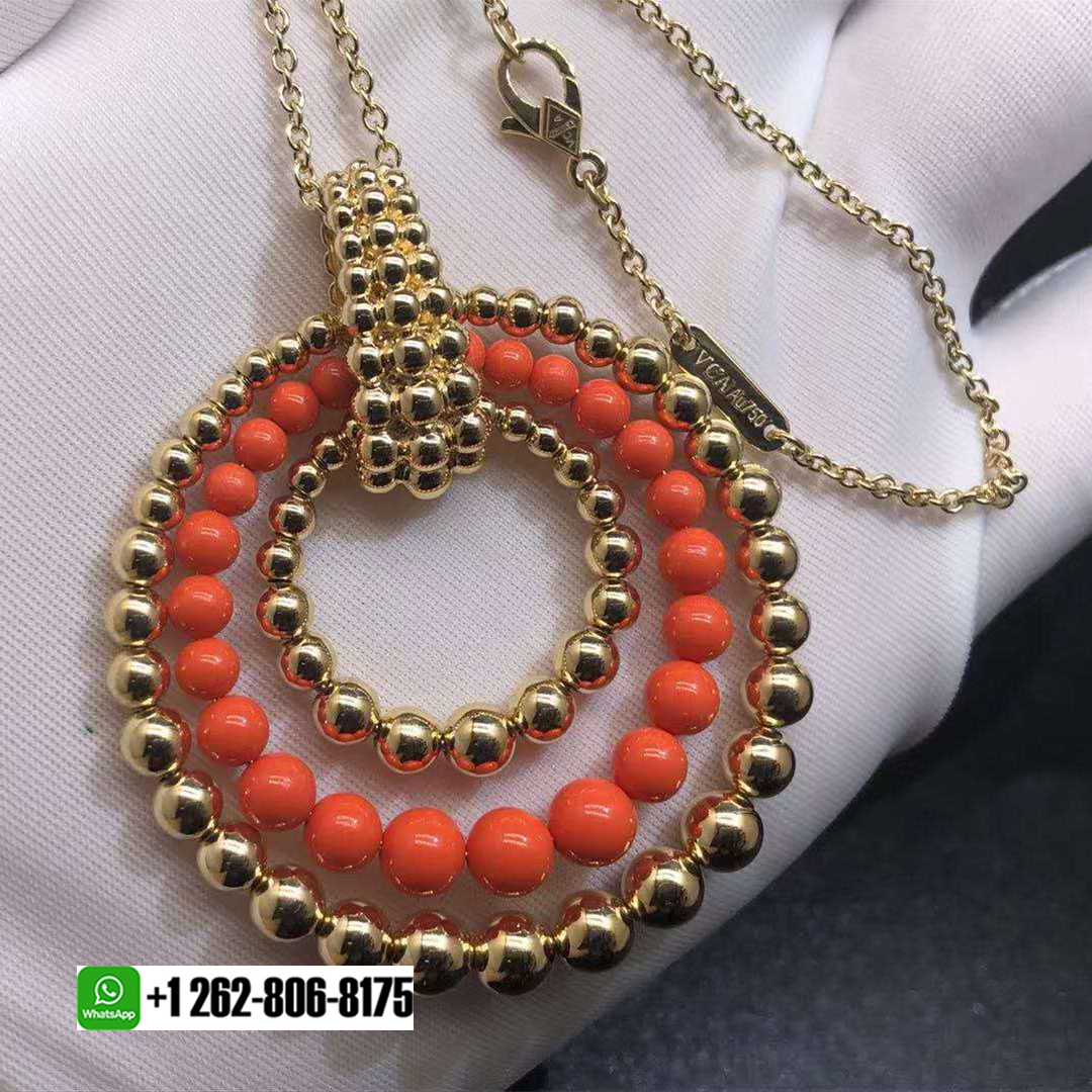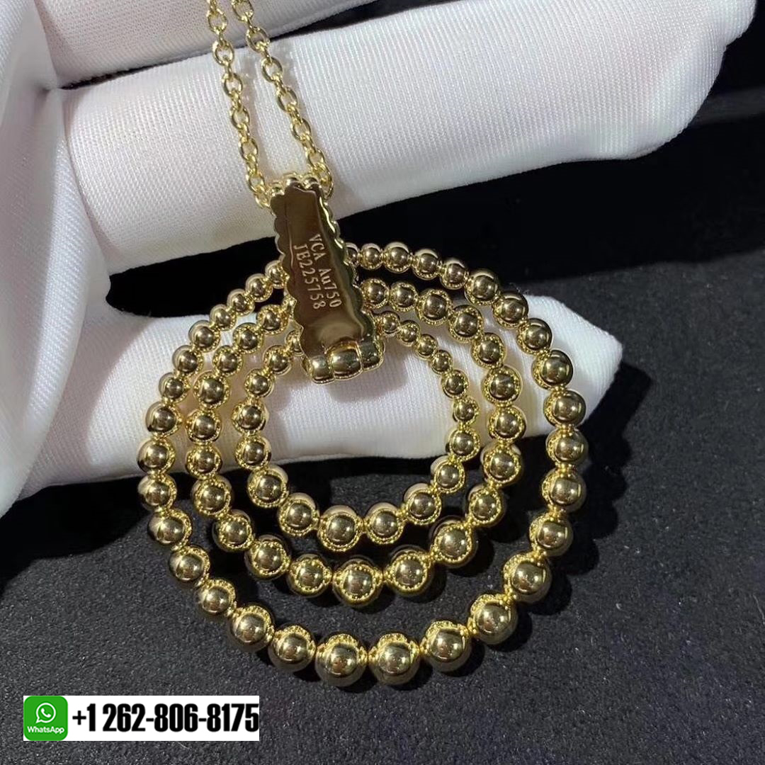 On a long chain in yellow gold, a pendant made up of three different-sized rings showcases the golden beads, motif which inspired the Maison’s creations for decades.