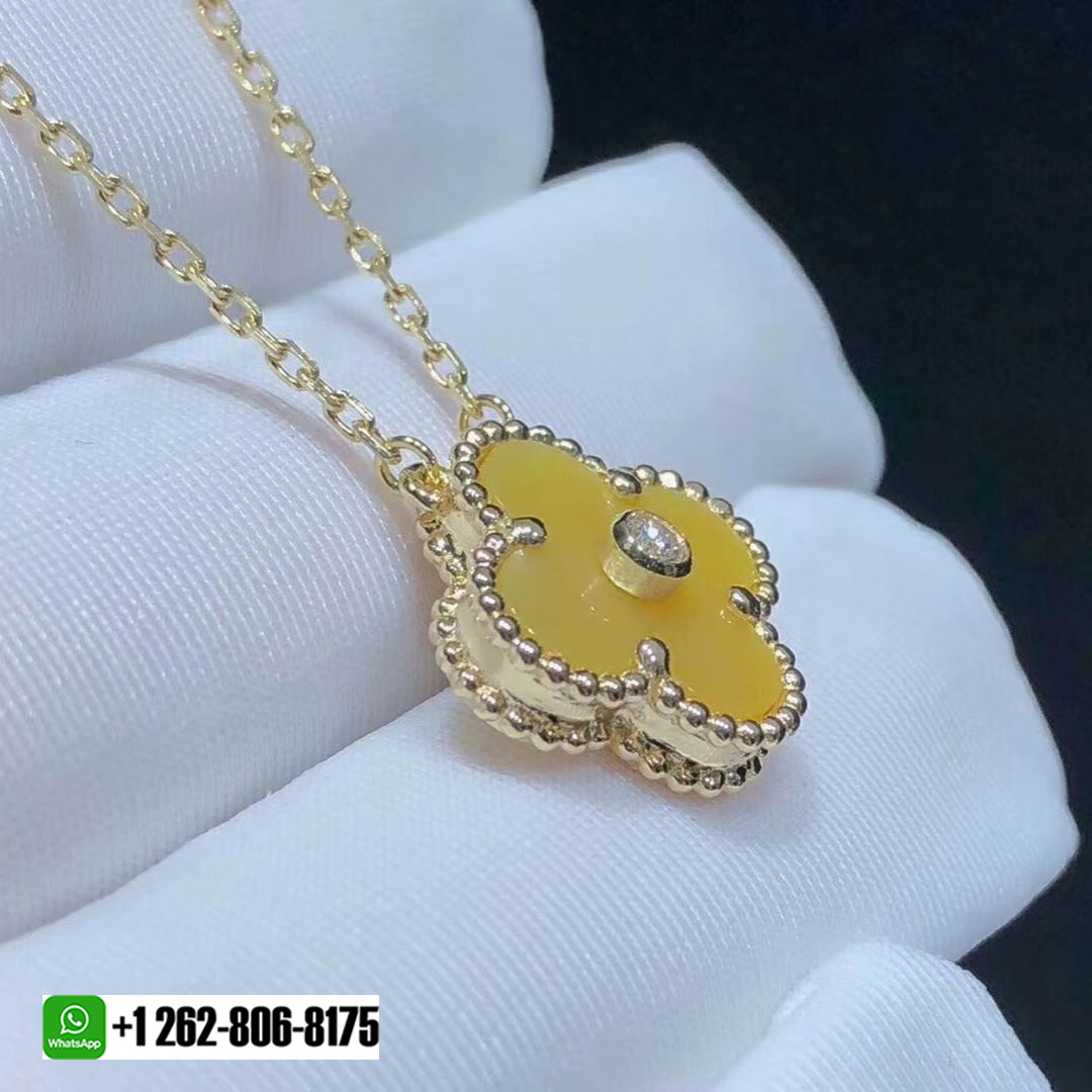 Designer 18K Gold Vintage Alhambra Necklace with Gold Mother of Pearl and set with a Diamond in the center.