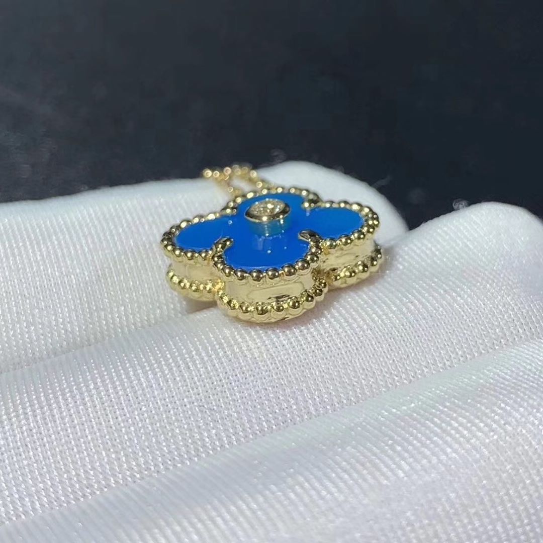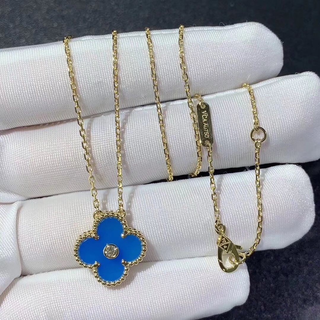 • VCA 18K Yellow Gold Blue Agate Diamond Single Motif Vintage Alhambra Pendant Necklace